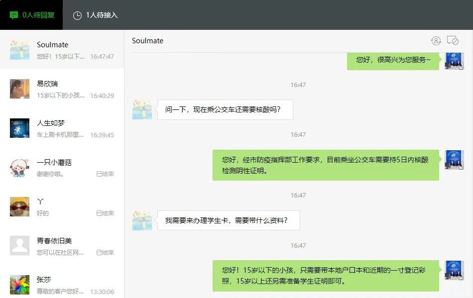 8月份升級開通網(wǎng)絡人工客服,市民通過荊門公交微信公眾號,與人工客服1號、2號坐席進行溝通,建立起集咨詢、尋物、建議、投訴等一體化的綜合在線服務。