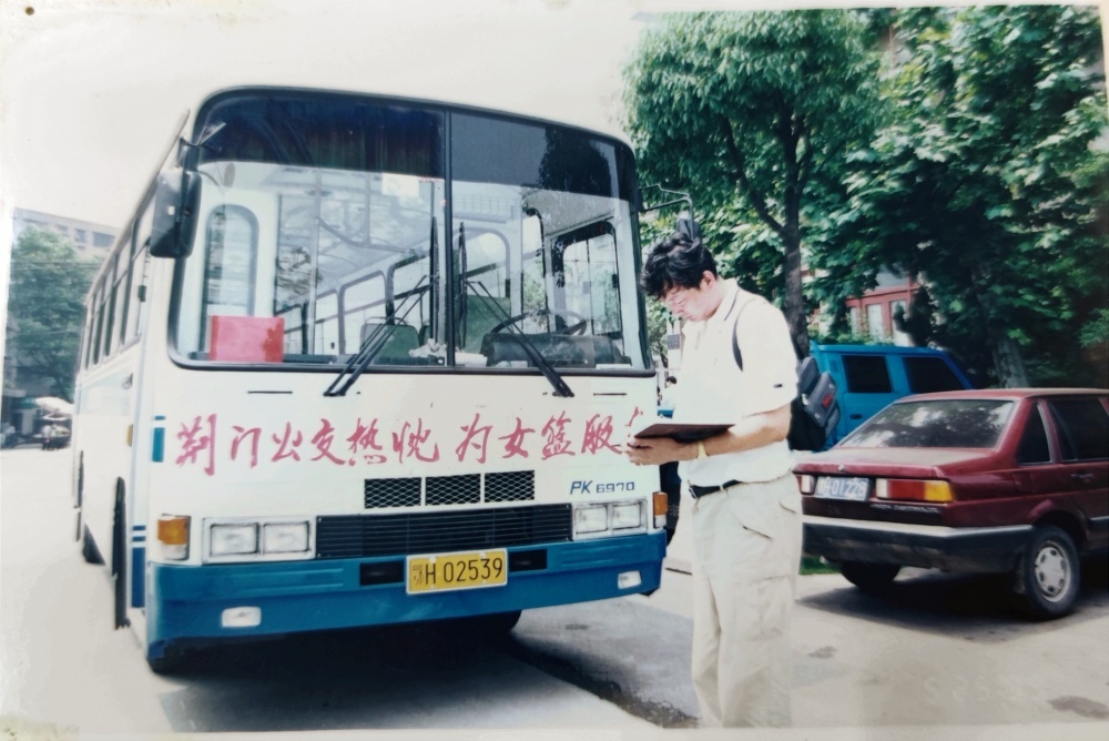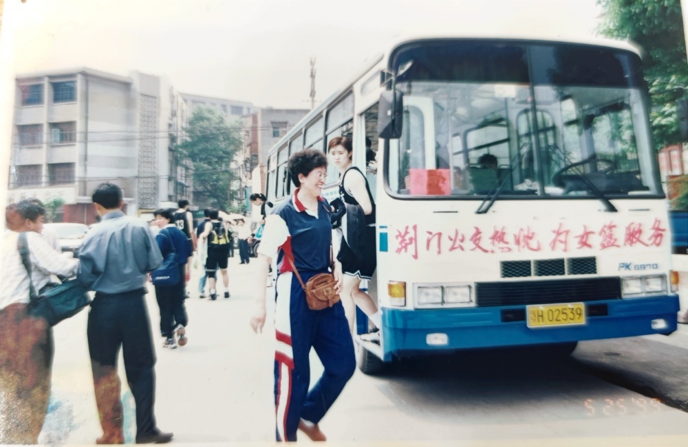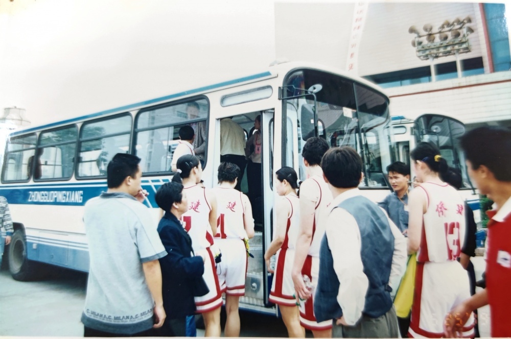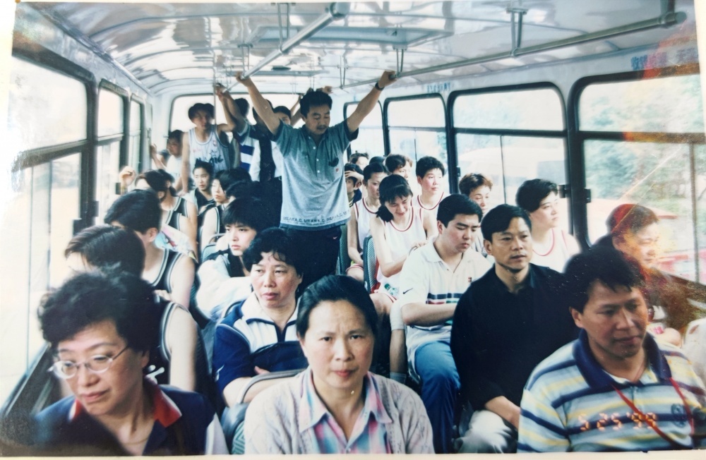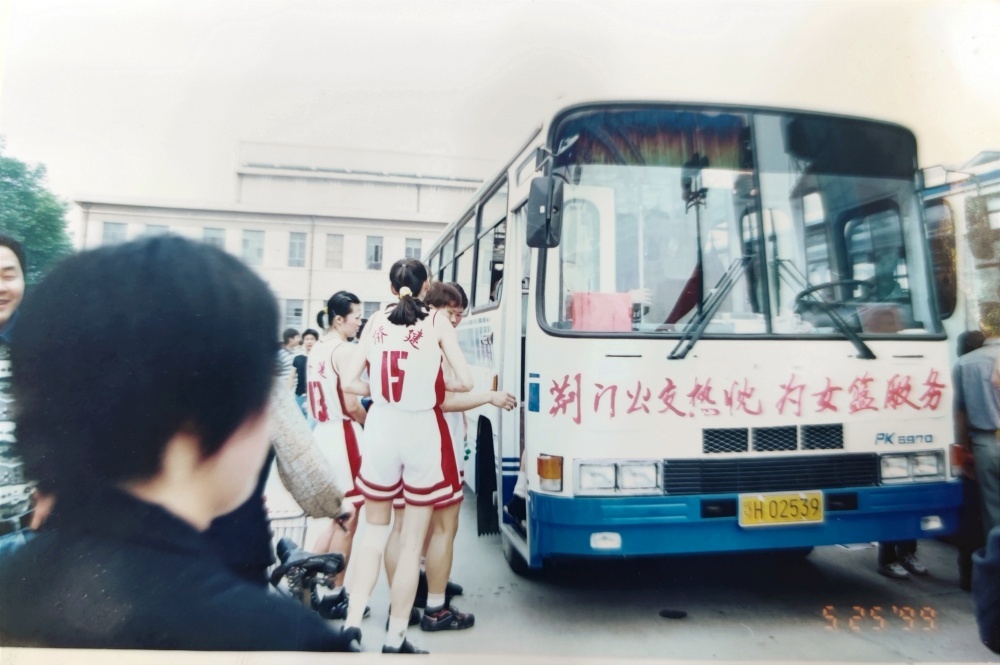 ▲1999年5月25日,沈陽電梯隊隊員、教練乘坐公交出行。公交車頭還掛有“荊門公交熱忱為女籃服務”橫幅。