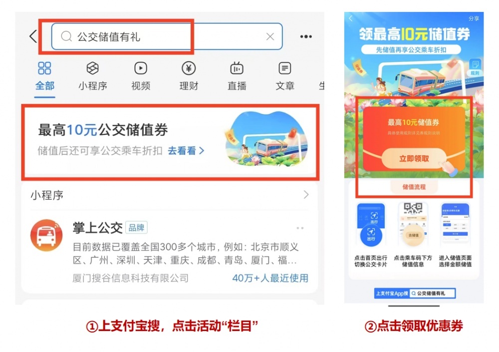 如何領(lǐng)取【儲(chǔ)值立減券】:活動(dòng)期間,上支付寶搜索【公交儲(chǔ)值有禮】或掃描下方二維碼,進(jìn)入活動(dòng)頁(yè)面,點(diǎn)擊“立即領(lǐng)取“,即可免費(fèi)領(lǐng)取公交儲(chǔ)值優(yōu)惠。