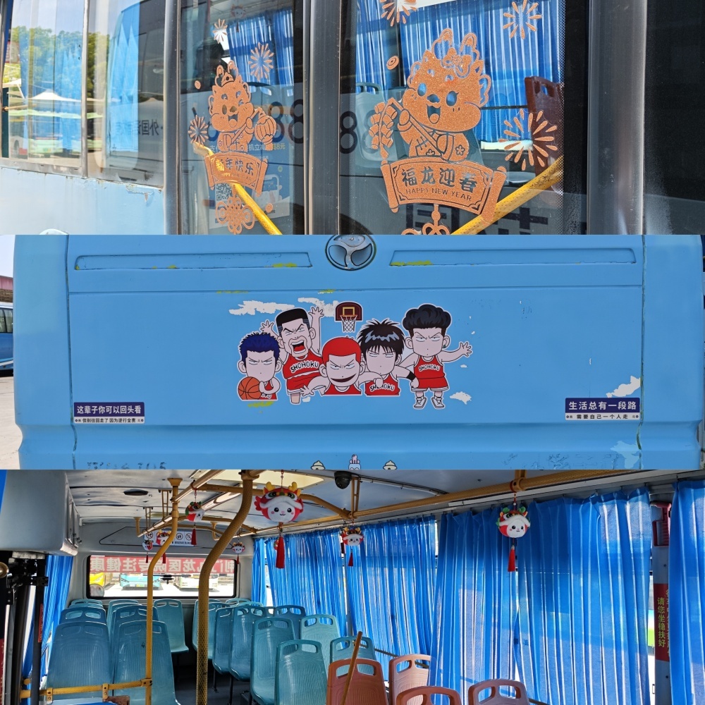 2020#車(chē)還有另外幾處細(xì)節(jié),引起小編注意,上下車(chē)門(mén)處貼有卡通人物和“福龍迎春”貼紙,車(chē)尾部貼有“灌籃高手”人物貼紙和提示標(biāo)語(yǔ),車(chē)廂內(nèi)的扶手桿則掛滿(mǎn)了喜慶娃娃。看到這些裝飾和布置,仿佛感受到了駕駛員的熱情、認(rèn)真和細(xì)膩。