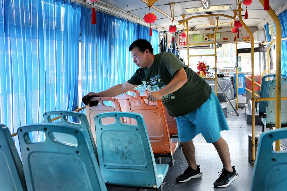 2020#車(chē)是揚(yáng)子江早年出廠的一輛“老爺車(chē)”,今年即將達(dá)到報(bào)廢年限,但走進(jìn)車(chē)廂內(nèi),地板明亮反光,車(chē)窗清晰透亮,窗簾座椅清爽整潔,更像是一輛嶄新的“空調(diào)車(chē)”,問(wèn)起如何將車(chē)輛打掃得如此干凈,張峻峰講出了他的工作心得。