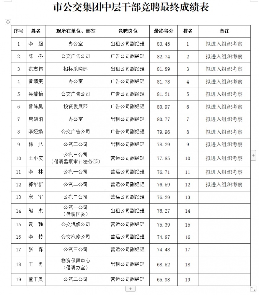 市公交集團中層干部競聘最終成績公示