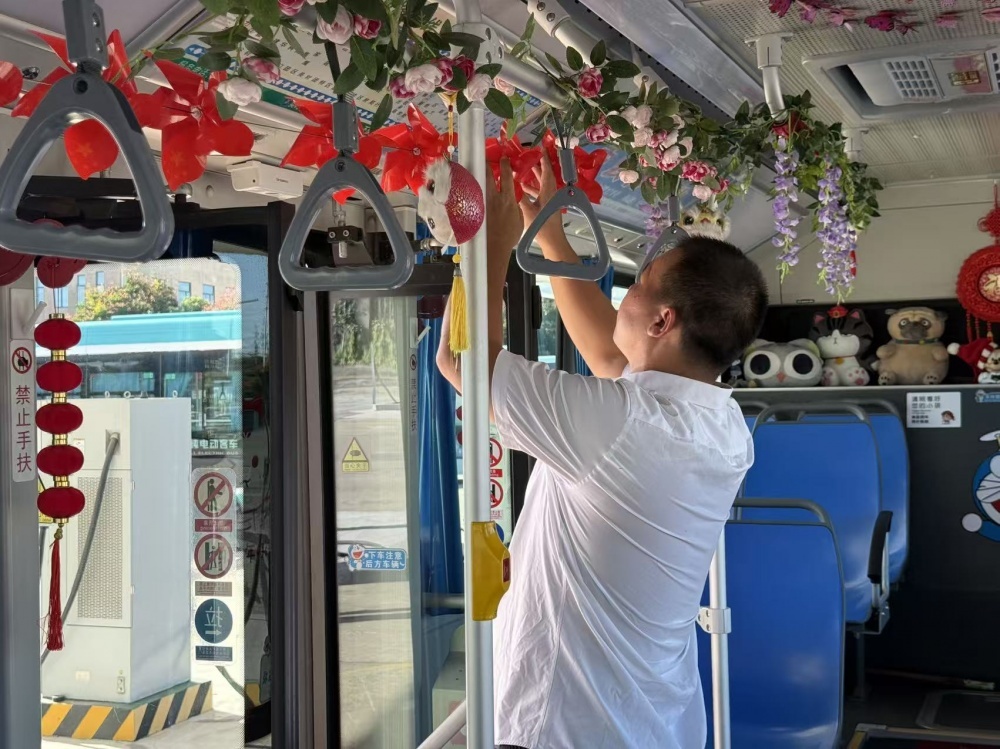 張峻峰是荊門(mén)公交2024年度“最美公交人”,他的車(chē)上總比別人多點(diǎn)“暖心”東西:駕駛座旁的小盒子里備著暈車(chē)藥、創(chuàng)可貼和折疊傘?!敖衲陣?guó)慶,就想乘客上車(chē)能樂(lè)呵樂(lè)呵?!庇谑菑埦寰蛣?dòng)了裝飾車(chē)廂的念頭。他自費(fèi)買(mǎi)了小國(guó)旗、風(fēng)車(chē)、燈籠等裝飾,晚上在家剪剪貼貼,白天利用休息時(shí)間在車(chē)上裝飾。張峻峰的行動(dòng),也是荊門(mén)公交服務(wù)提升的一個(gè)縮影。