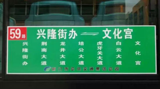 59路起于興隆街辦,止于荊門(mén)工人文化宮,全線(xiàn)共行駛興隆街辦、荊南大道、龍井大道、培公大道、虎牙關(guān)大道、白云大道、文化宮等主要線(xiàn)、點(diǎn),覆蓋高新區(qū)東片區(qū)的國(guó)昊文化、華工科技等主要企業(yè),連接九派通眾創(chuàng)園、區(qū)政府、十里牌、天鵝湖、中心客運(yùn)站等。早班為6:36分發(fā)班,晚上18點(diǎn)收班。計(jì)劃投入公交車(chē)20輛,首批投入6輛試運(yùn)行。至1月20日后正式運(yùn)行。