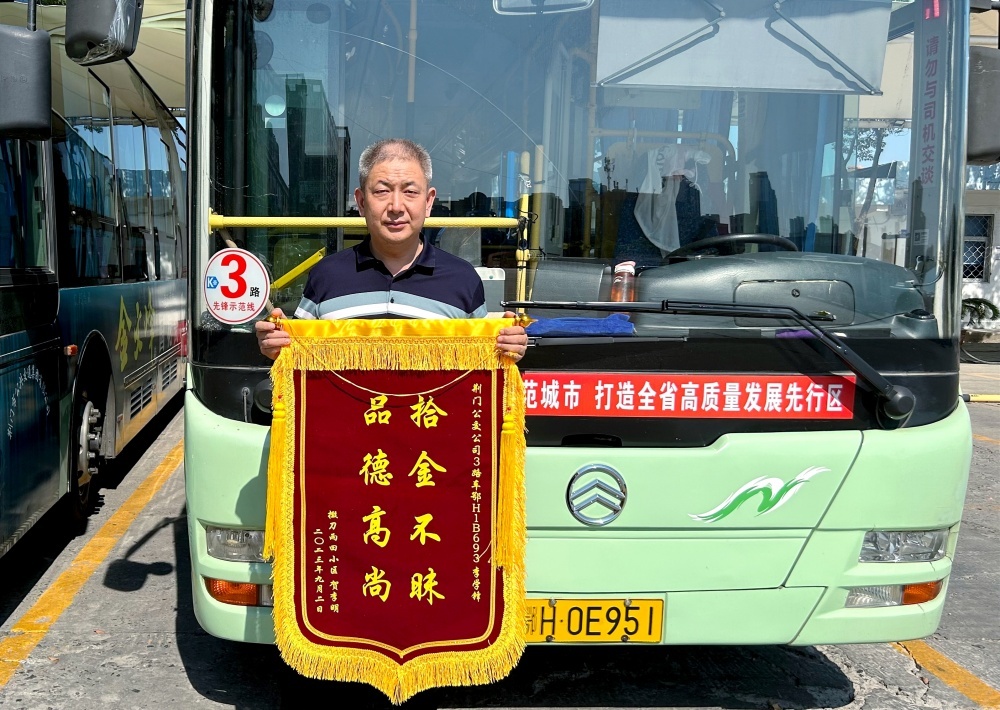 而另一邊,發(fā)現(xiàn)丟了錢包的賀先生在去往武漢的火車上著急萬分,抱著不確定的心態(tài)打電話到客服調(diào)度中心詢問,看能否找回,誰知火車才行至鐘祥站的時(shí)候,就接到了電話,說錢包已找到,賀先生頓時(shí)放下心來。待賀先生從武漢歸來后特地送來一面錦旗以表示感謝,為公交培養(yǎng)出李學(xué)鋒這樣拾金不昧的駕駛員師傅點(diǎn)贊。