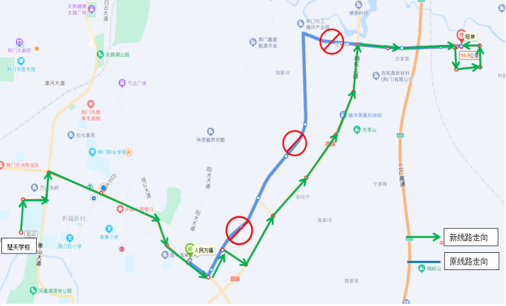 一.優(yōu)化調(diào)整33路公交線路走向 ◆首末站:楚天學(xué)?!郑ㄐ】的下繁保?/p> ◆首末班時間:6:50—17:45 ◆線路走向:響嶺路—運(yùn)動公園路—象山大道—深圳大道—培公大道—荊和大道—深圳大道—荊東大道—興化三路—格林北路—興化四路—小康南路 ◆??空军c:楚天學(xué)校、雙喜街辦、運(yùn)動公園路、萬達(dá)廣場、掇刀檢察院、掇刀法院、掇刀公安分局、南城明珠、中國人民銀行、市氣象局、襄荊高速、雙泉社區(qū)、人民萬福商貿(mào)城、人民一品花園、虎頭山、殯儀館、馮廟村、固潤科技、東方雨虹、圣通石化、荊東消防、荊東大道興化五路口、潤都制藥、興化三路西、興化三路中、興化三路盈德氣體、紐蘇萊、旺林、興化四路、小康南路北。 ◆取消原33路途經(jīng)荊和大道等路段站點:荊和大道南、陽光五路、陽光四路、陽光三路、化工產(chǎn)業(yè)園行政大樓。 二.優(yōu)化調(diào)整69路公交發(fā)班時間 ◆調(diào)整前 園博園東門發(fā)班時間:6:40、7:40、15:30、16:30、17:15 玲瓏輪胎發(fā)班時間:7:30、8:30、16:30、17:30、18:00 ◆調(diào)整后 園博園東門發(fā)班時間:6:40、7:20、15:30、16:30 玲瓏輪胎發(fā)班時間:7:30、8:20、12:20、16:20、17:30